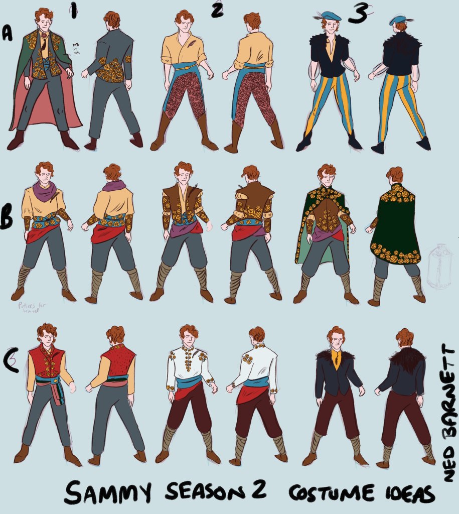 I selected the third row as my favorite costume for Sammy, particularly in that it builds on itself to create several looks, ranging from casual to battle to travel.
